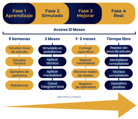 La formación está organizada en módulos. Cada 7 días se libera uno nuevo, y en un plazo de 5 semanas tendrás acceso a todo el contenido completo. Para el día 35 se libera el canal de telegram GOLD (3 Meses). Antes es solo la teoría.